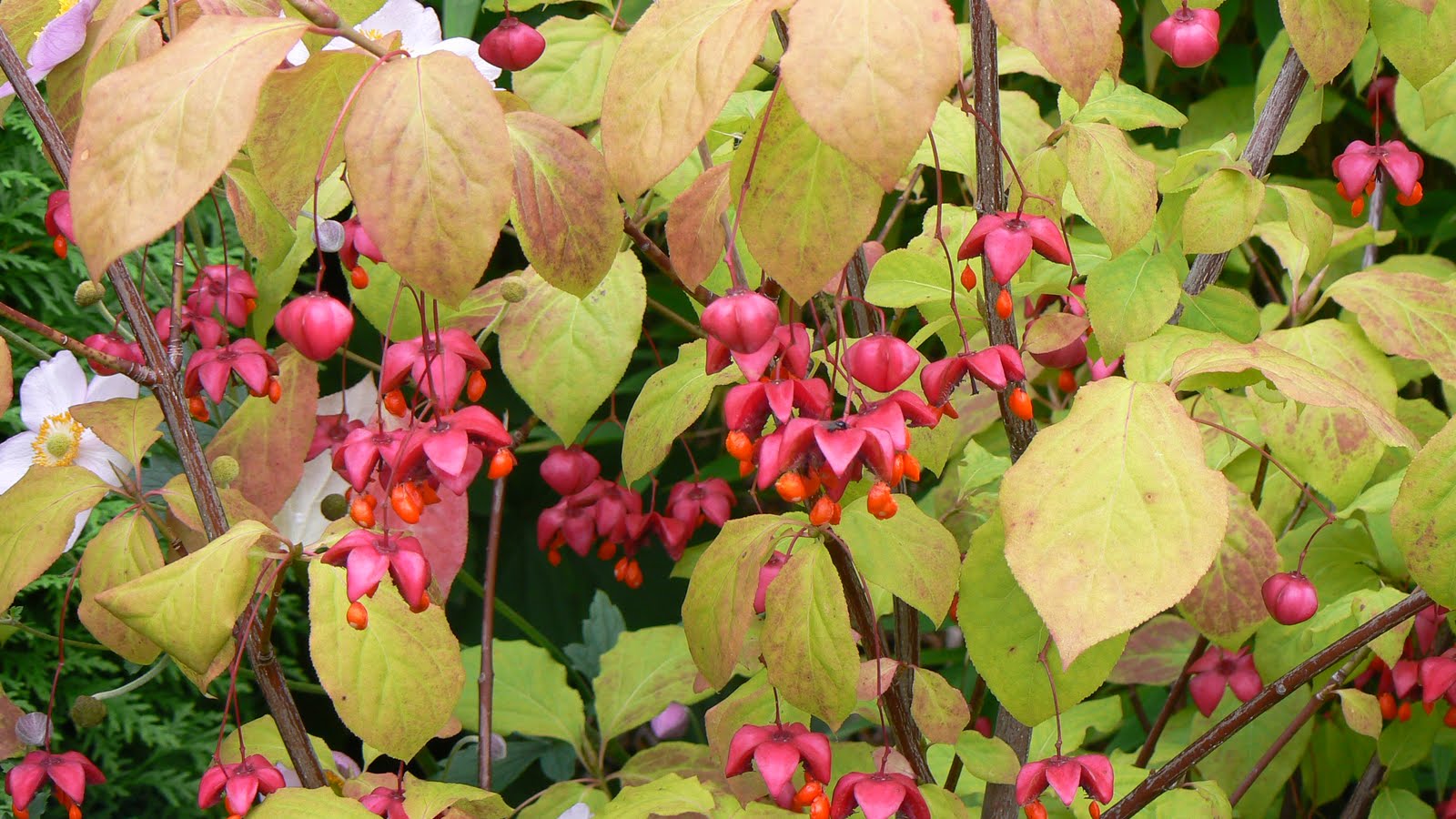 Blickfånget inifrån köksfönstret: körsbärsbenveden Euonymus planipes kommer upp i lagom höjd för att visa sina vackra frukter om hösten.