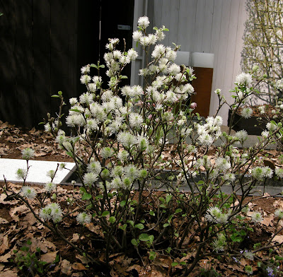 Den lilla häxalen Fothergilla gardenii blommar med sina vita små borstar om våren; här fångad i Zetas fina monter på Trädgårdsmässan i våras. Om hösten bjuder den ett sprakande skådespel i rödgult!